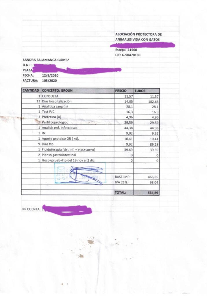 El otro día nos enviaron la factura de lo que han sido sus pruebas, su medicación y 13 de los días que ha pasado en la clínica, un total de 564,89€. Necesitamos vuestra ayuda para pagarla. Tenemos esta y otras deudas con las clínicas a las que llevamos a nuestros peques y no sabemos cómo las vamos a pagar. Si no podéis colaborar, por favor, difundir para que llegue a mucha gente y entre todos podamos abonarla.