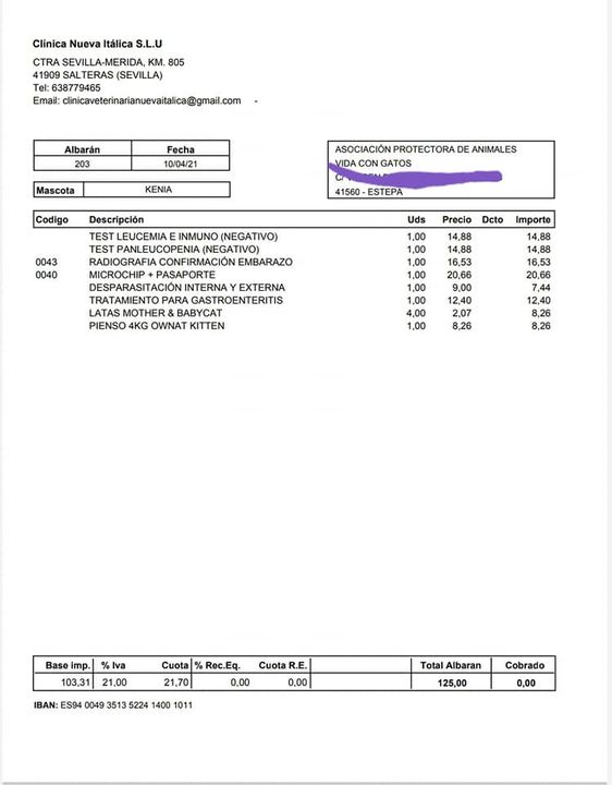 De momento necesitamos vuestra ayuda para poder liquidar la deuda que tenemos en la clínica de la primera visita de Kenia. Son 125€ de los que hemos recudado 25€(muchas gracias a las personas que nos lo han donado), así que aún necesitamos recaudar los 100 restantes. Os dejamos el albarán por aquí abajo