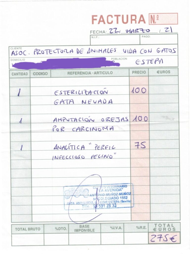 Hemos recaudado 100€ de los 275€ que debemos de las intervenciones y la analítica de Nevada. Así que necesitamos 175€ más para poder saldar la deuda que tenemos de ella en el veterinario.