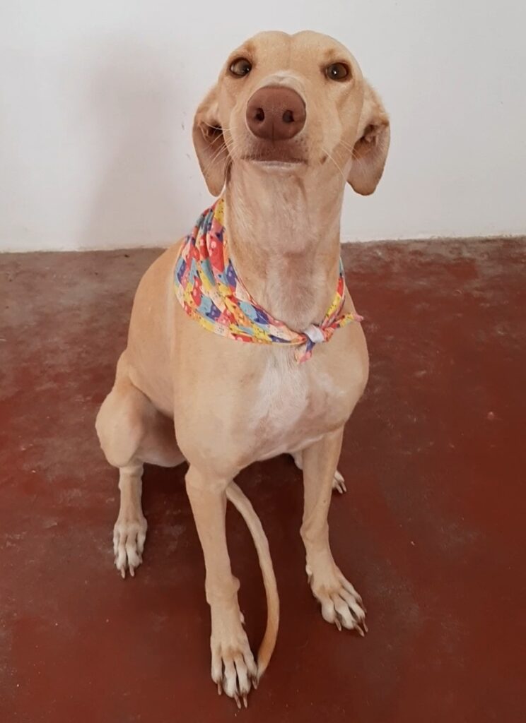Nela fue encontrada solita y asustada vagando por los caminos. Por suerte pudimos rescatarla. A pesar de todo, ha tenido mucha suerte, tiene unos adoptantes que la están esperando impacientes y que van a hacerla muy feliz.